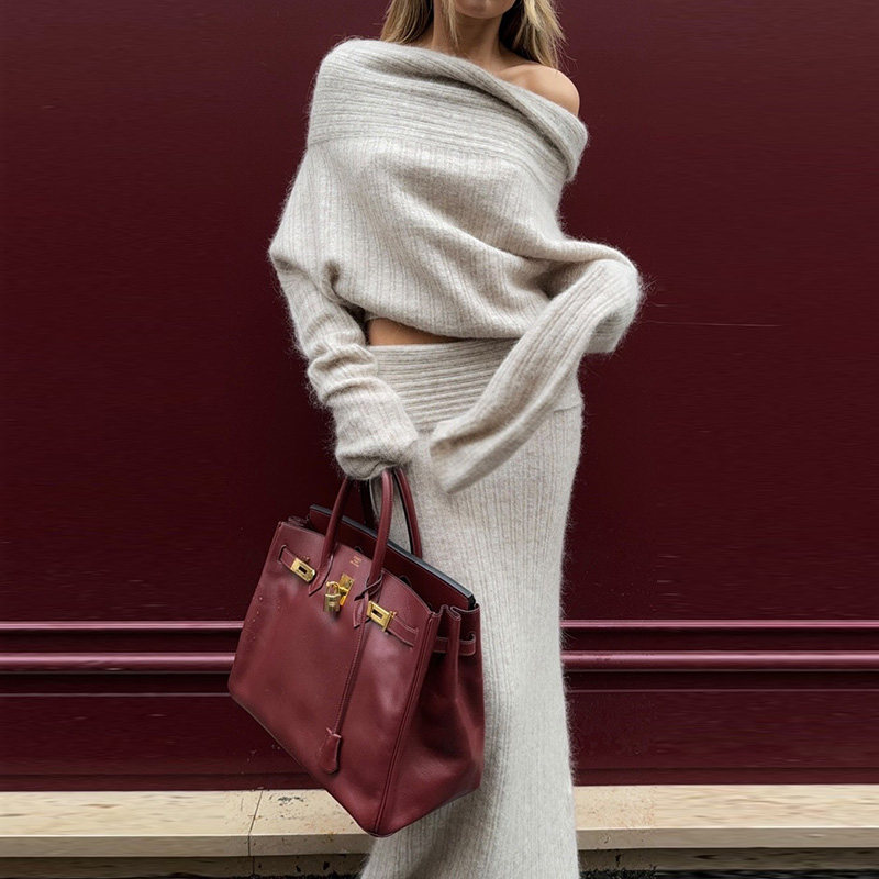 This women’s two-piece set combines a cozy off-shoulder knit sweater with a stylish cuffed fishtail skirt, perfect for early autumn wear. The relaxed “lazy style” sweater adds effortless comfort, while the high-waist fishtail skirt creates a flattering and feminine silhouette. Inspired by European and American casual fashion, this set is versatile for both everyday wear and chic street style looks. Lightweight yet warm, it pairs beautifully with ankle boots, sneakers, or loafers. Ideal for brunches, casual outings, or seasonal layering, this set offers an elegant, comfortable, and trend-conscious outfit option for women.
