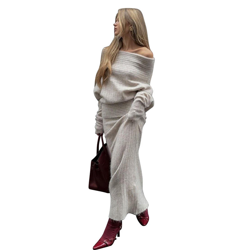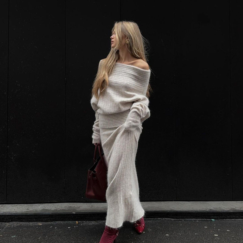 Cxqdy | Women’s Off-Shoulder Knit Sweater and Fishtail Skirt Early Autumn Two-Piece Set