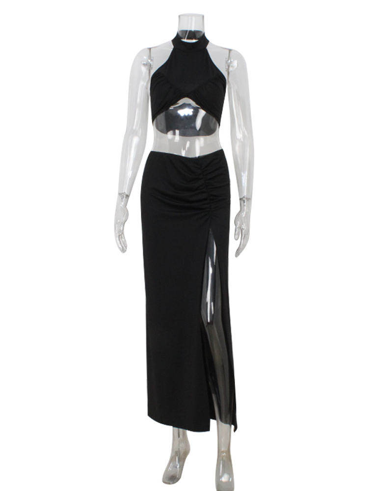 Cxqdy | Navel-Baring High-Neck Vest & Sexy Slit Skirt Suit for Women